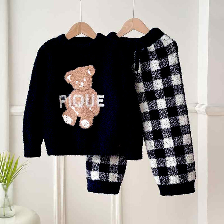 Boy Navy Blue Pique Bear Embroidery With Check Pajama Fur Two Piece Set