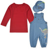 Boy Soft Denim Dungaree 3 Pieces Set With Red Lining Shirt and Embroidery Dino Cap